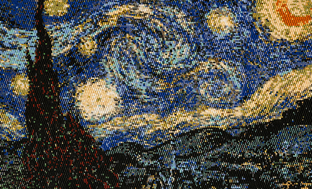She then showed off some of her pieces, including a colonial house, an Italian landscape, birch trees, and Vincent van Gogh’s “Starry Night” in bead form.