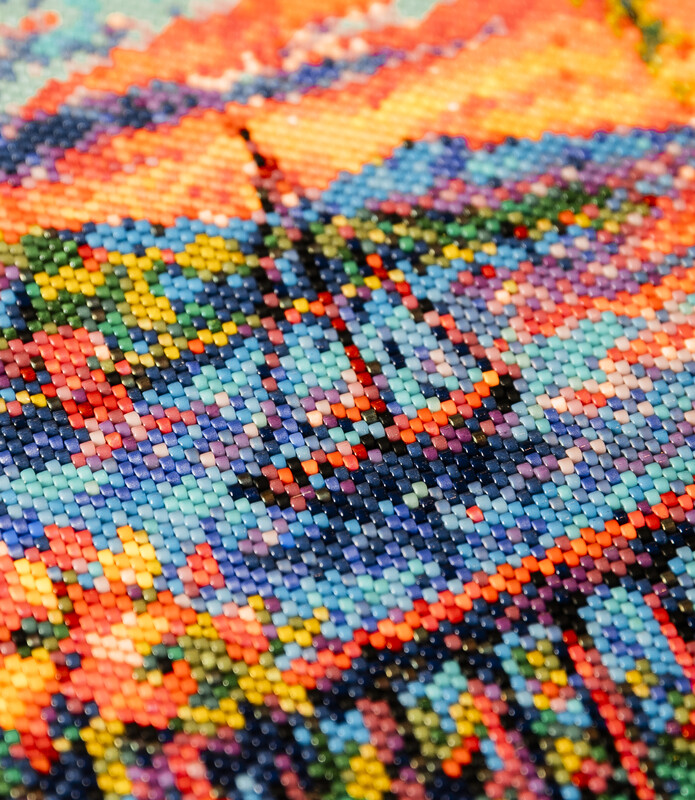 A software converts Chang’s image of her choosing into beads; she then uses beads from a Japanese company called Miyuki and hand selects the colors that she wants to match the image. This alone, before any beadwork is involved, can take anywhere between a week and a month.
